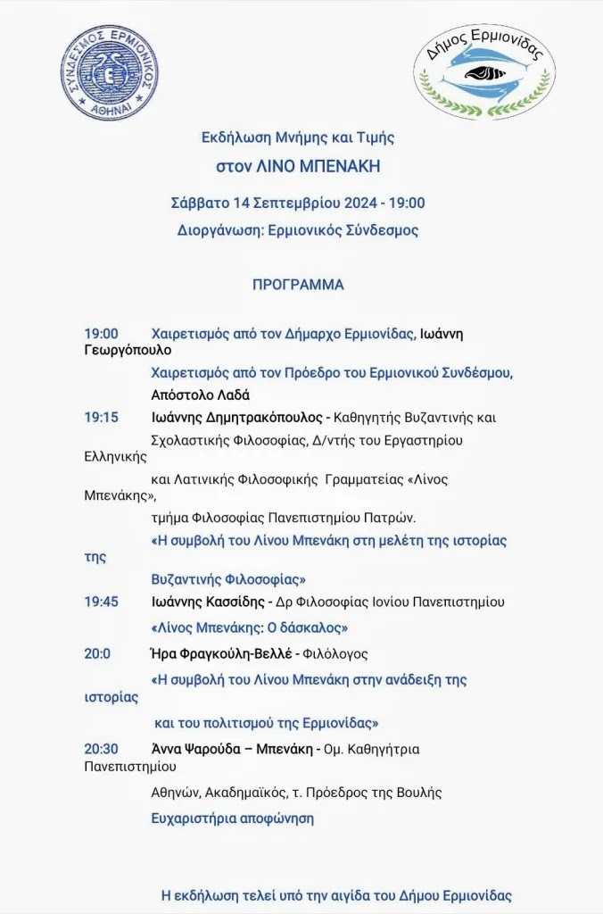 Το Διοικητικό Συμβούλιο του ΕΡΜΙΟΝΙΚΟΥ ΣΥΝΔΕΣΜΟΥ έχει την τιμή να σας προσκαλέσει στην «Εκδήλωση Μνήμης και Τιμής για τον Λίνο Μπενάκη» .