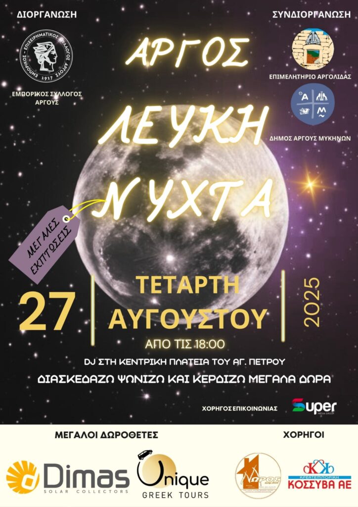 Την Τετάρτη 27 Αυγούστου 2025 έχει προγραμματισθεί η Λευκή Νύχτα από τον Εμπορικό Σύλλογο Άργους.