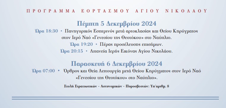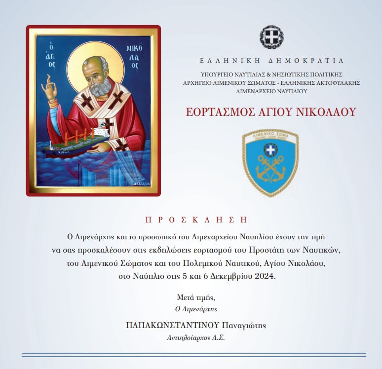 Ο λιµενάρχης, αντιπλοίαρχος Λ.Σ. Παναγιώτης Παπακωνσταντίνου και το προσωπικό του Λιµεναρχείου Ναυπλίου σας προσκαλούν στις εκδηλώσεις εορτασµού του προστάτη των Ναυτικών, του Λιµενικού Σώµατος και του Πολεµικού Ναυτικού, Αγίου Νικολάου, στο Ναύπλιο στις 5 και 6 ∆εκεµβρίου.
