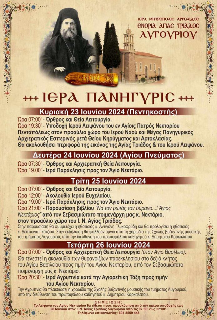 Το πρόγραμμα του εορτασμού της Αγίας Τριάδας και την υποδοχή ιερού Λειψάνου του Αγίου Νεκταρίου Πενταπόλεως ανακοίνωσε η Ενορία Αγίας Τριάδος Λυγουριού στο Δήμο Επιδαύρου.