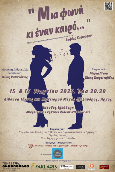 Ο Σύλλογος «Φίλοι του Δημοτικού Ωδείου Άργους» και η Μικτή Χορωδία Ενηλίκων του Συλλόγου παρουσιάζουν τη μουσικοθεατρική παράσταση σε πρωτότυπο κείμενο της Σοφίας Καψούρου «Μια φωνή κι έναν καιρό…» στις 15 και 16 Μαρτίου 2025, ώρα 20.30, στην Αίθουσα Τέχνης και Πολιτισμού «Μέγας Αλέξανδρος» στο Άργος με τη συνεργασία του Δήμου Άργους – Μυκηνών, πιστοί στην υπόσχεση που δώσαμε πέρυσι σ’ όλους εσάς που θέλατε να την επαναλάβουμε.