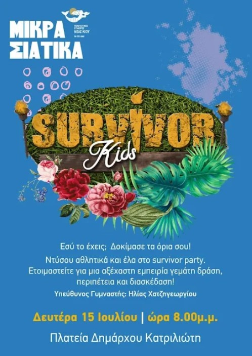 Σήμερα το απόγευμα, Δευτέρα 15 Ιουλίου στην πλατεία του Δημάρχου Κατριλιώτη, ο γυμναστής Ηλίας Χατζηγεωργίου καλεί τα παιδιά σε ένα survivor party.
