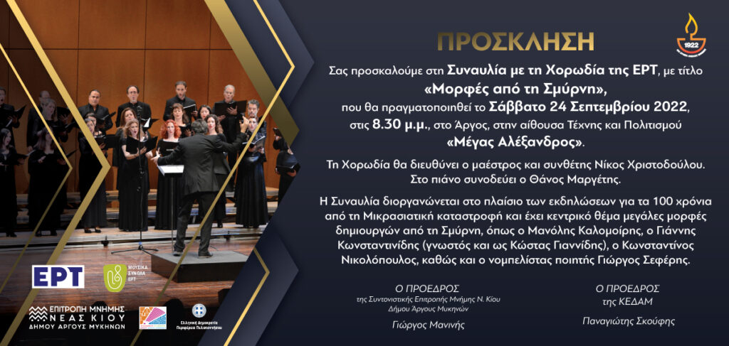 Η Επιτροπή Μνήμης Νέας Κίου του Δήμου Άργους-Μυκηνών, σε συνεργασία με την ΚΕΔΑΜ και την Περιφέρεια Πελοποννήσου, στο πλαίσιο των εκδηλώσεων για τα 100 χρόνια από τη Μικρασιατική καταστροφή, διοργανώνει Συναυλία, με τη Χορωδία της ΕΡΤ, που θα πραγματοποιηθεί το Σάββατο 24 Σεπτεμβρίου 2022, στις 8.30 μ.μ., στο Άργος, στην αίθουσα Τέχνης και Πολιτισμού «Μέγας Αλέξανδρος».