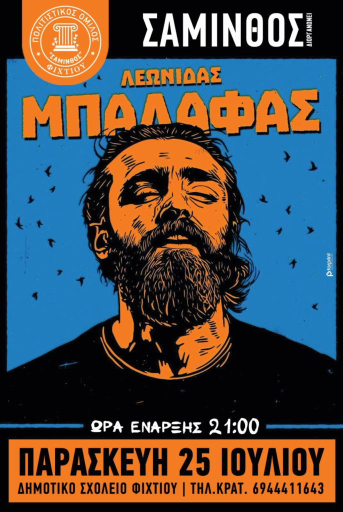 Ο πολιτιστικός όμιλος “Σάμινθος” σας προσκαλεί σε μια μοναδική καλοκαιρινή βραδιά με τον Λεωνίδα Μπαλάφα την Παρασκευή 25 Ιουλίου στις 21:00 στον προαύλιο χώρο του Δημοτικού Σχολείου Φιχτίων.