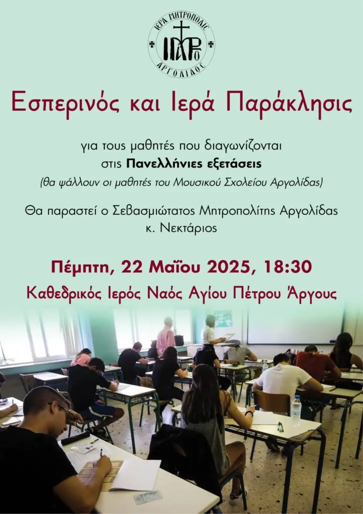 Την Πέμπτη 22 Μαϊου 2025 στις 18:30 στον Ιερό Ναό Αγίου Πέτρου Άργους ο Βυζαντινός χορός του ΜΟΥΣΙΚΟΥ ΣΧΟΛΕΙΟΥ ΑΡΓΟΛΙΔΑΣ θα συμμετάσχει στον Εσπερινό- Παράκληση που θα γίνει για όλους τους διαγωνιζόμενους των πανελλαδικών εξετάσεων. Στην τελετή θα παραστεί και ο Μητροπολίτης Αργολίδας.