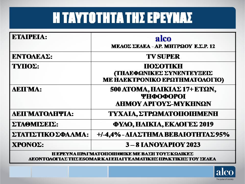 Νέα δημοσκόπηση της έγκριτης εταιρείας δημοσκοπήσεων ALCO διενεργήθηκε για λογαριασμό Περιφερειακού τηλεοπτικού σταθμού στον Δήμο Άργους Μυκηνών. Τα ποσοστά που έδωσαν οι πολίτες του Δήμου στον Δήμαρχο Άργους Μυκηνών Δημήτρη Καμπόσο και στην δημοτική παράταξη ξεπέρασαν κάθε προσδοκία, επιβεβαιώνοντας πως ο κόσμος έχει αναγνωρίσει το μεγάλο έργο της δημοτικής μας αρχής και δείχνει τον νικητή των εκλογών του Οκτωβρίου 2023 από την πρώτη Κυριακή. Σε δείγμα 500 ατόμων, όταν εθνικής εμβέλειας δημοσκοπήσεις χρησιμοποιούν δείγμα 600 ατόμων, η τηλεφωνική έρευνα επιβεβαίωσε πως ο Δήμαρχος Άργους Μυκηνών Δημήτρης Καμπόσος είναι το πρόσωπο με την μεγαλύτερη αναγνωρισιμότητα αλλά και εκείνος που θα εκλεγεί από την πρώτη Κυριακή με ισχυρό ποσοστό. Δείτε λοιπόν τα αποτελέσματα της δημοσκόπησης όπως παρουσιάστηκε χθες βράδυ από τον τηλεοπτικό σταθμό TVSUPER: