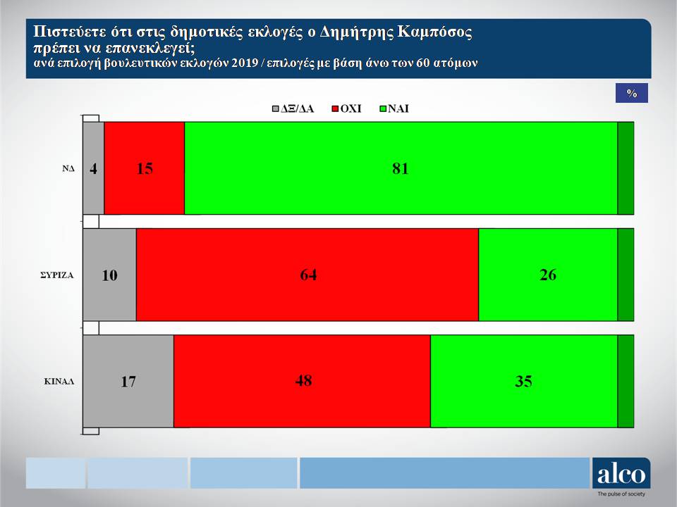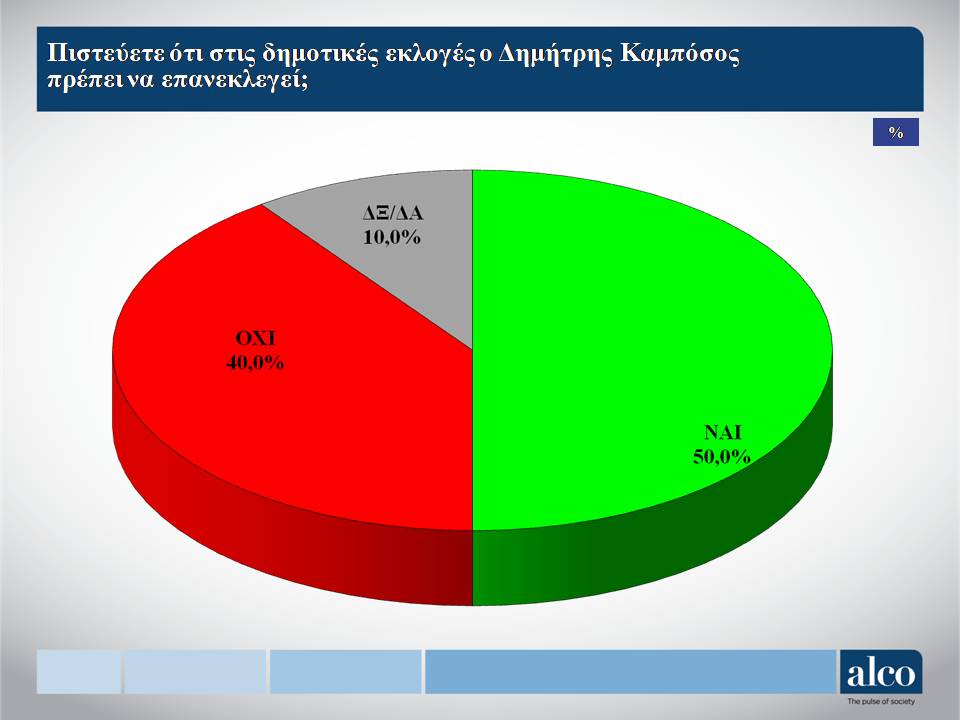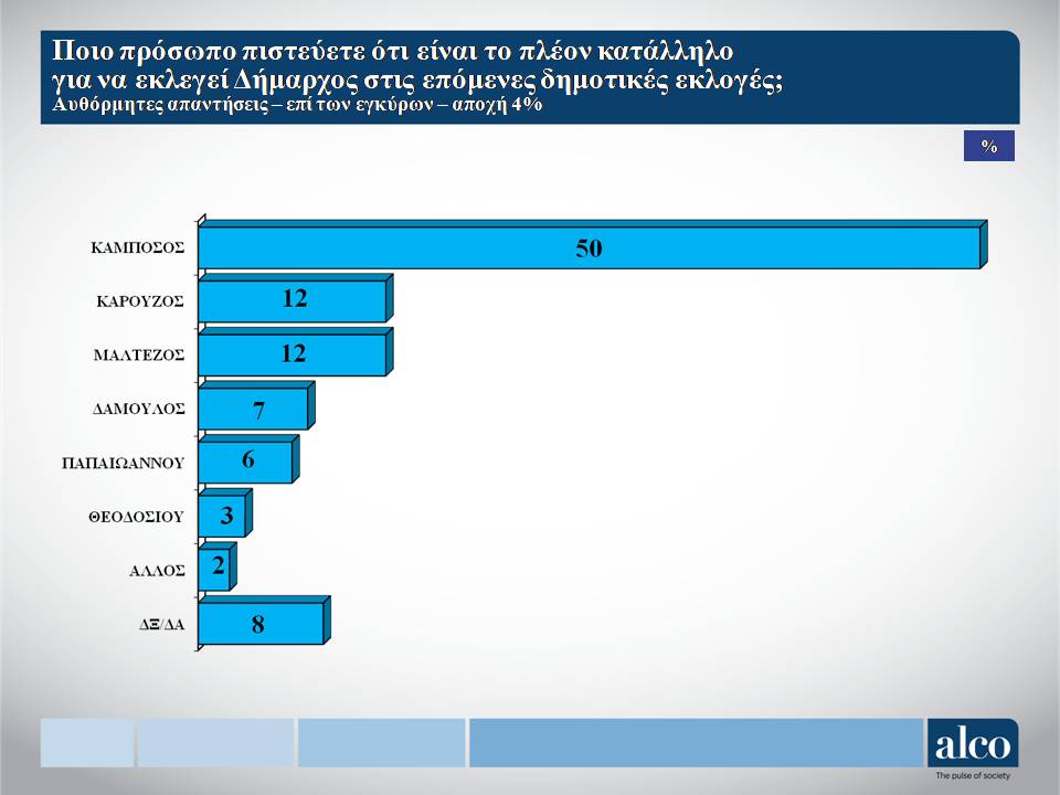 Στο ερώτημα για την καταλληλόλητα εκλογής Δημάρχου η κυριαρχία του Δημήτρη Καμπόσου είναι ξεκάθαρη καθώς έχει τεράστια διαφορά από τον δεύτερο κατακτώντας το 50% έναντι των, Καρούζος 12%, Μαλτέζος 12%, Δαμούλος 7%, Παπαιωάννου 6%, Θεοδοσίου3%, άλλος 2% και ΔΞ/ΔΑ 8%.