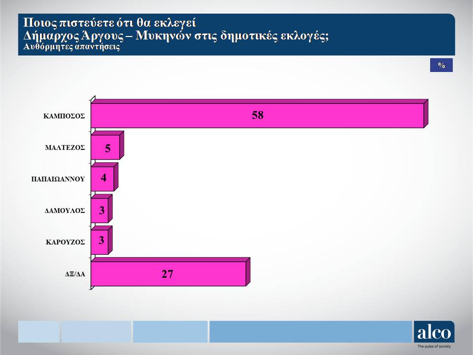 Σε αυτό το εύρημα διαπιστώνει κανείς το μεγάλο ποσοστό αναγνωρισιμότητας του Δημάρχου Άργους Μυκηνών η οποία αγγίζει το 83% με θετική άποψη για εκείνον να έχει το 58%.