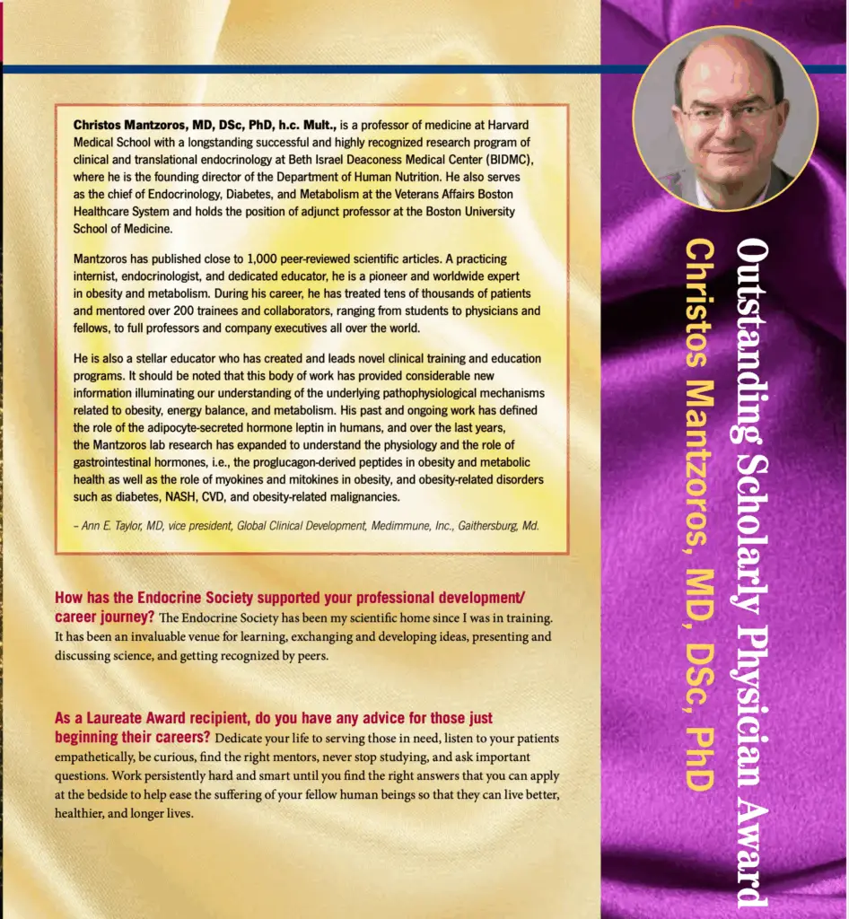 Αυτό το ετήσιο βραβείο που αναγνωρίζει εξαιρετικές συνεισφορές στην κλινική ενδοκρινολογία σε ακαδημαϊκά περιβάλλοντα φέτος θα απονεμηθεί στον Χρήστος Μαντζώρο που έτσι θα τιμηθεί για την πολυεπίπεδη προσφορά του στην ενδοκρινολογία
