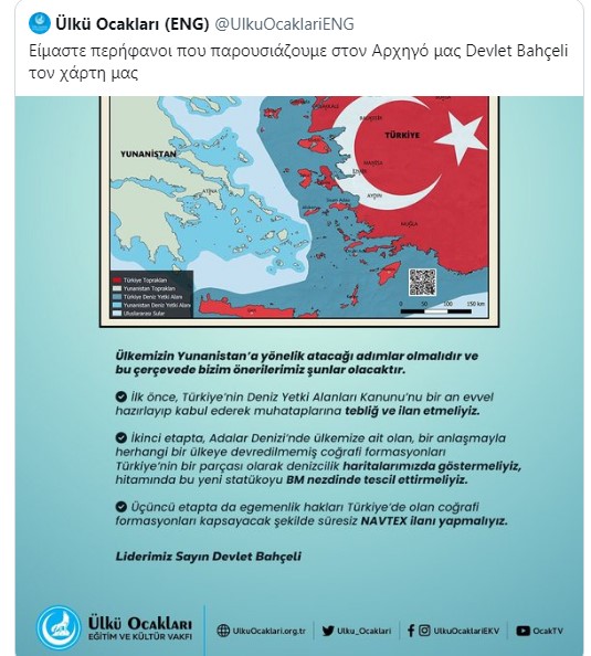 «Είμαστε υπερήφανοι που παρουσιάζουμε στον Αρχηγό μας Ντεβλέτ Μπαχτεσλί τον χάρτη μας, που ετοιμάσαμε με επίγνωση της σημασίας και της δύναμης της Γαλάζιας Πατρίδας, που σηματοδοτεί τη συνοριακή γραμμή μπροστά στην εθνική συνείδηση των νησιών μας, όπου η ένδοξη ημισέληνος και το αστέρι κυμάτισαν για αιώνες, αλλά άδικα έγινε αντικείμενο σφετερισμού από την Ελλάδα, που ονομάζονται «ΤΑ ΕΘΝΙΚΑ ΣΥΝΟΡΑ ΜΑΣ ΣΤΗ ΘΑΛΑΣΣΑ», ο οποίος χάρτης περιλαμβάνει το QR της ομιλίας του Αξιότιμου Αρχηγού μας Ντεβλέτ Μπαχτσελί με θέμα τη Γαλάζια Πατρίδα και το Αιγαίο Πέλαγος.