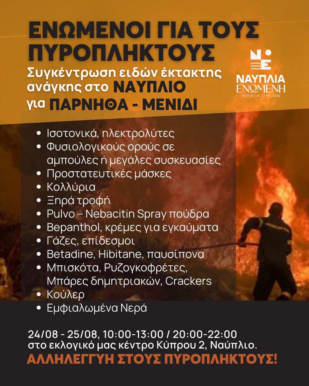 ΟΛΟΙ ΜΑΖΙ συγκεντρώνουμε είδη έκτακτης ανάγκης για τους πυρόπληκτος από τις φωτιές σε Πάρνηθα-Μενίδι!