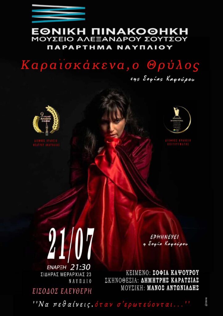 Η Εθνική Πινακοθήκη φιλοξενεί τη βραβευμένη με το Διεθνές Βραβείο της Ανατολίας Σοφία Καψούρου την Κυριακή 21 Ιουλίου, η οποία θα παρουσιάσει στον προαύλιο χώρο της Εθνικής Πινακοθήκης Ναυπλίου, το θεατρικό μονόλογό της «Καραϊσκάκενα, o Θρύλος» για μία και μοναδική παράσταση. Στην Πανσέληνο του Ιουλίου, κάτω από το φως του φεγγαριού, οι θεατές θα έχουν την ευκαιρία να ζήσουν μία μοναδική θεατρική εμπειρία. Ένα ταξίδι στον χρόνο, όπου το σήμερα θα συνομιλήσει με τα χρόνια του αγώνα του ’21 και η πρώτη πρωτεύουσα του ελληνικού κράτους θα ζωντανέψει ξανά μέσα από τη ζωή της Ζωής Διαμάντως Διμισκή, μητέρας του αρχιστράτηγου Γεώργιου Καραϊσκάκη. Ένα αντιπολεμικό έργο σε καιρό πολέμου. Ένα έργο ύμνος στη γυναίκα και την ελευθερία της.