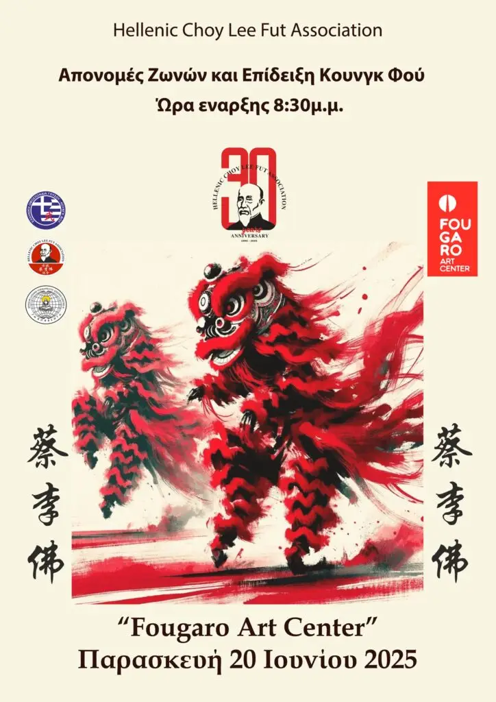 Την Παρασκευή 20 Ιουνίου, στο Fougaro Art Center στο Ναύπλιο, σας προσκαλούμε σε μια ξεχωριστή εκδήλωση αφιερωμένη στα 30 χρόνια παρουσίας του Choy Lee Fut στην Ελλάδα.