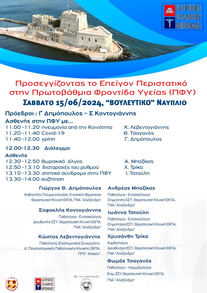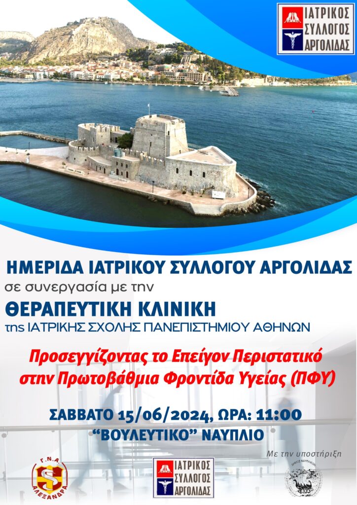Σας ενημερώνουμε για την ημερίδα που συνδιοργανώνει ο Ιατρικός Σύλλογος Αργολίδας με τη Θεραπευτική Κλινική της Ιατρικής Σχολής του Πανεπιστημίου Αθηνών και θα πραγματοποιηθεί στο Ναύπλιο στην αίθουσα Βουλευτικού, το Σάββατο 15 Ιουνίου 2024.