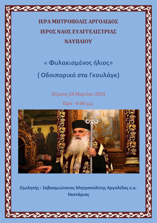 Η εκδήλωση με ομιλητή τον Σεβασμιώτατο Μητροπολίτη Αργολίδας κ.κ. Νεκτάριος, θα πραγματοποιηθεί στις 6:00 μ.μ την Πέμπτη 23 Μαρτίου 2023, στον Ιερό Ναό Ευαγγελιστρίας Ναυπλίου.