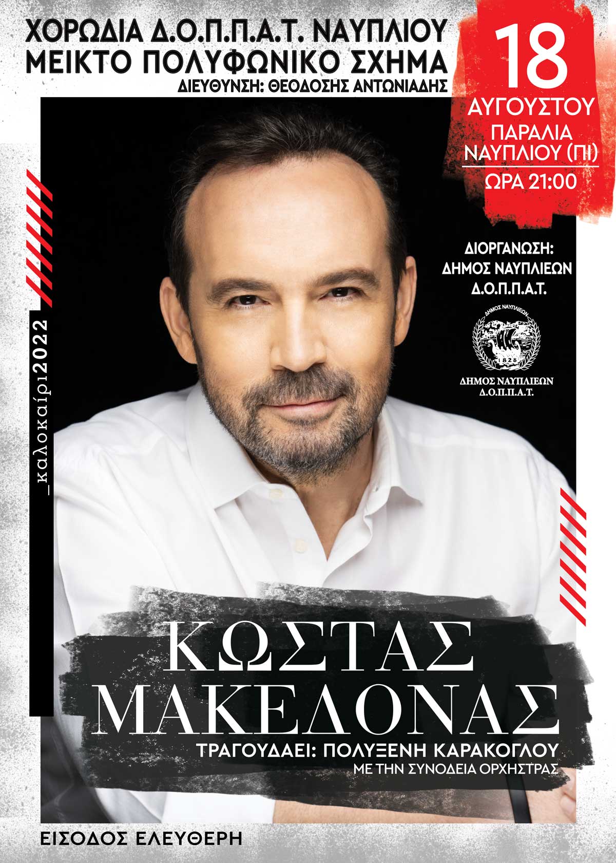 Στο πλαίσιο των καλοκαιρινών εκδηλώσεων, ο Δήμος Ναυπλιέων και ο ΔΟΠΠΑΤ πρόκειται να συνδιοργανώσουν μουσική εκδήλωση στο ΠΙ – Λιμάνι Ναυπλίου σήμερα Πέμπτη 18.08 και ώρα 21.00, με τον Κώστα Μακεδόνα σε μια συνεργασία με το μεικτό πολυφωνικό σχήμα χορωδίας ΔΟΠΠΑΤ Ναυπλίου και την νεανική χορωδία ΔΟΠΠΑΤ Ναυπλίου υπό την Διεύθυνση του μαέστρου Θεοδόση Αντωνιάδη.
