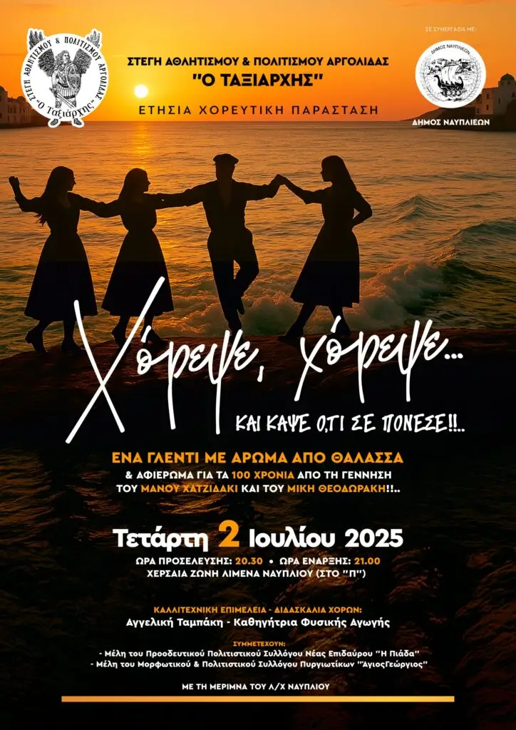 Ο Δήμος Ναυπλιέων, σε συνεργασία με το Λιμεναρχείο Ναυπλίου, σας προσκαλεί σε μια ξεχωριστή βραδιά γεμάτη χορό, μουσική και συγκίνηση, την Τετάρτη 2 Ιουλίου 2025, στις 20:30, στη χερσαία ζώνη του λιμένα Ναυπλίου.