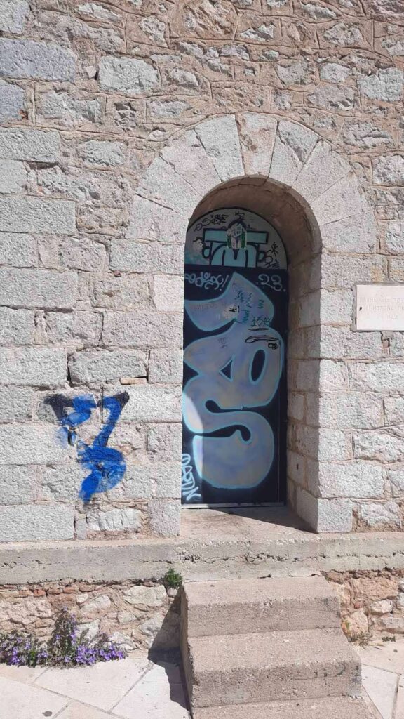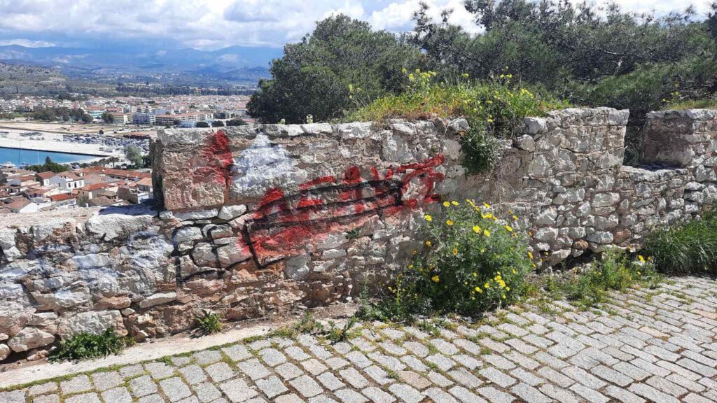 Τα ανεξέλεγκτα αυτά γκράφιτι που “ξεφυτρώνουν” σε κάθε αρχαιολογικό χώρο της πόλης μας δεν συνάδουν με την υψηλή αισθητική του τόπου μας και “βεβηλώνουν” την πλούσια πολιτιστική μας κληρονομιά.