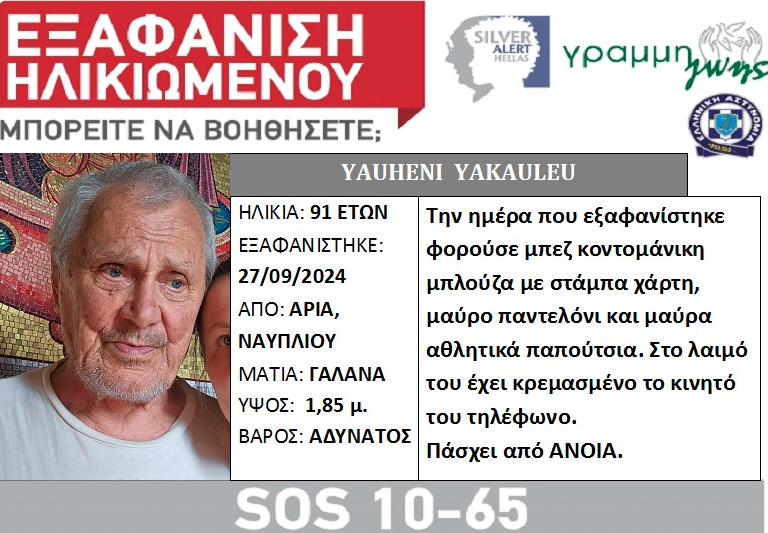 Νεκρός βρέθηκε το μεσημέρι της Κυριακής 10 Νοεμβρίου, ο 91χρονος Ευγένιος Γιάκοβλεβ που είχε εξαφανισθεί στις 27 Σεπτεμβρίου 2024 στην περιοχή της Άριας Ναυπλίου.