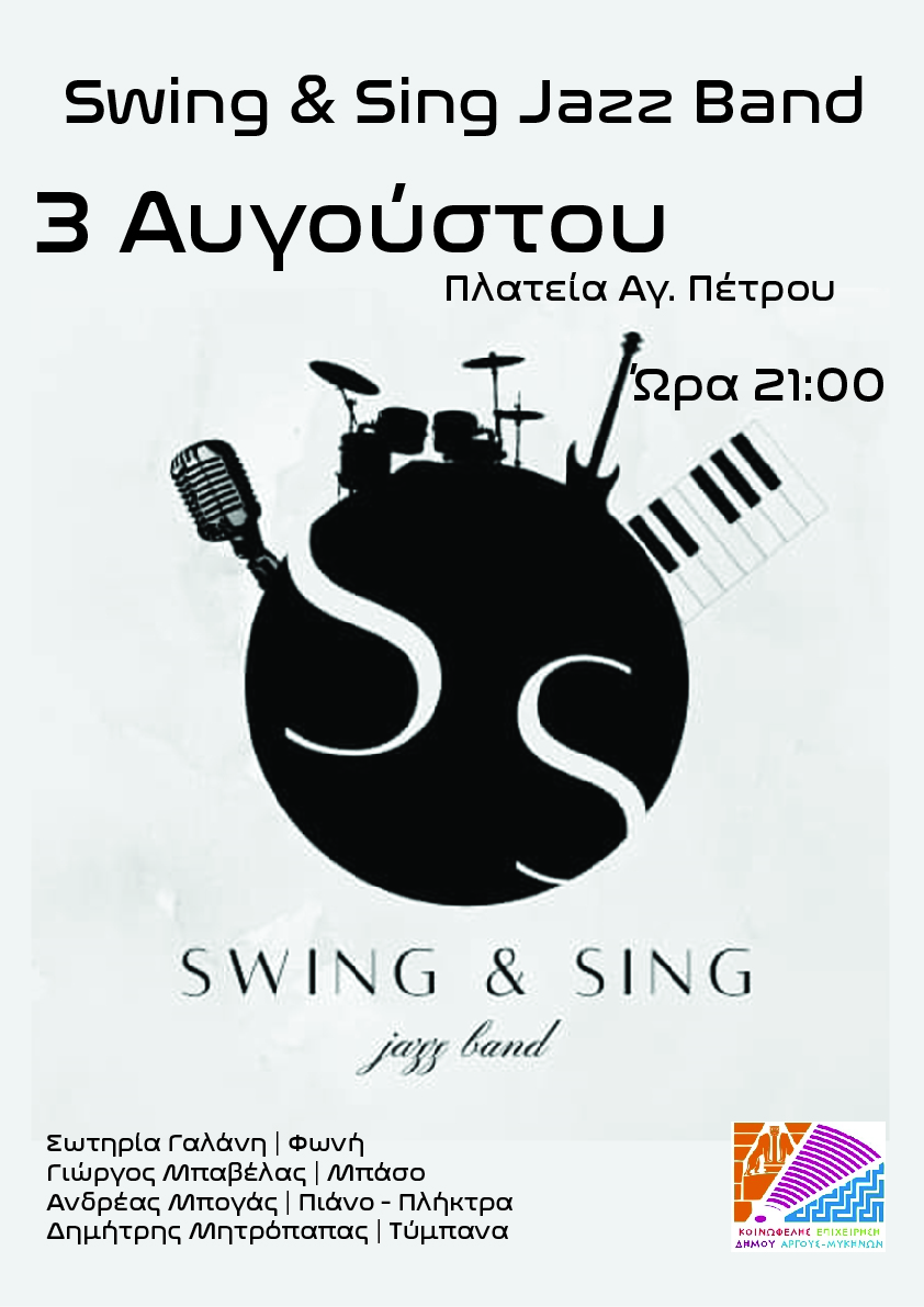 Την 1η μέρα της Έκθεσης θα πλαισιώσει μουσικά το συγκρότημα Swing & Sing, μια ομάδα ντόπιων μουσικών, οι οποίοι διασκευάζουν και … υπόσχονται ότι θα μας διασκεδάσουν, με τραγούδια από την ελληνική & ξένη μουσική σκηνή σε ηχοχρώματα της jazz.