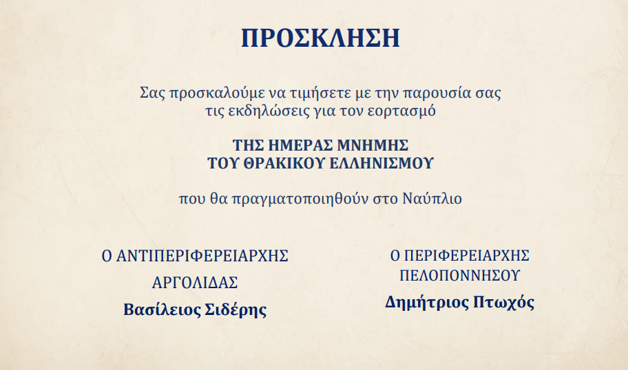 11:30 Επιμνημόσυνη δέηση και κατάθεση στεφάνων από εκπρόσωπο της της Βουλής των Ελλήνων, της Περιφέρειας Πελοποννήσου, του Δήμου Ναυπλιέων και του Συλλόγου Θρακών Αργολίδας στο Μνημείο των Ηρώων της πόλης (25ης Μαρτίου), όπου θα τηρηθεί σιγή ενός λεπτού στη μνήμη των ένδοξων νεκρών του Έθνους.