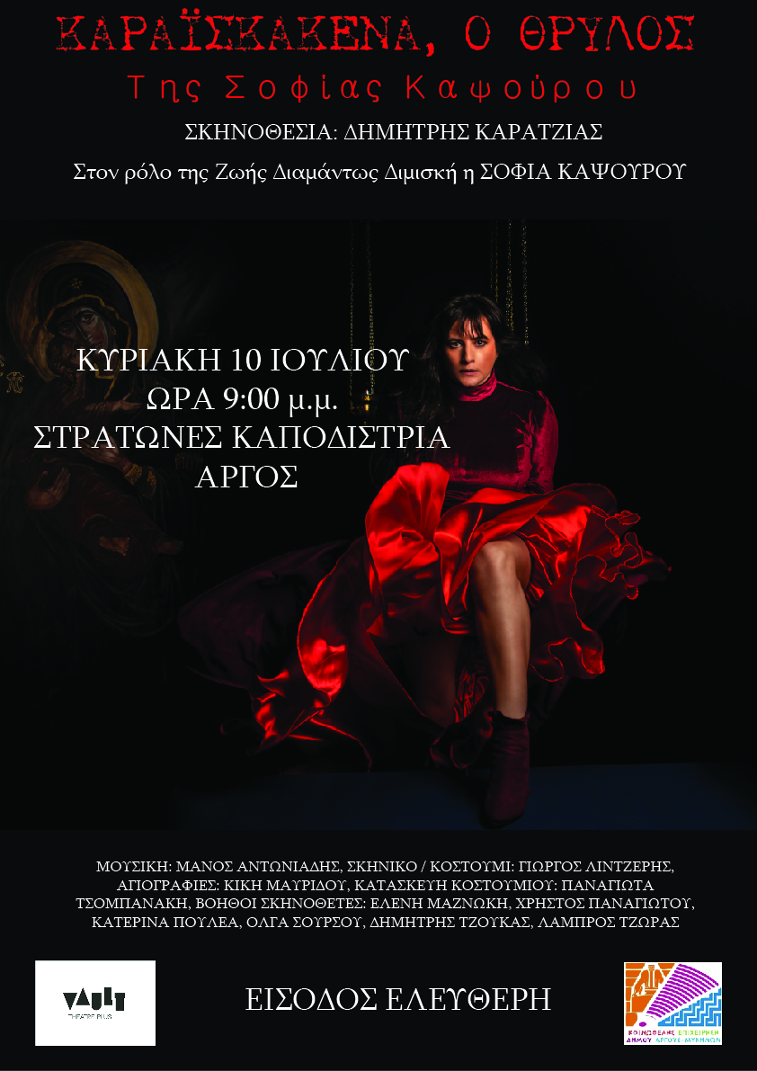 • Στις Στρατώνες Καποδίστρια στο Άργος, την Κυριακή 10 Ιουλίου 2022 και ώρα 9:00 μ.μ., η ΚΕΔΑΜ παρουσιάζει την παράσταση «Καραϊσκάκενα, o Θρύλος» της Σοφίας Καψούρου σε σκηνοθεσία Δημήτρη Καρατζιά με τη Σοφία Καψούρου στον ρόλο της Ζωής Διαμάντως Διμισκή, μητέρας του Γεώργιου Καραϊσκάκη.