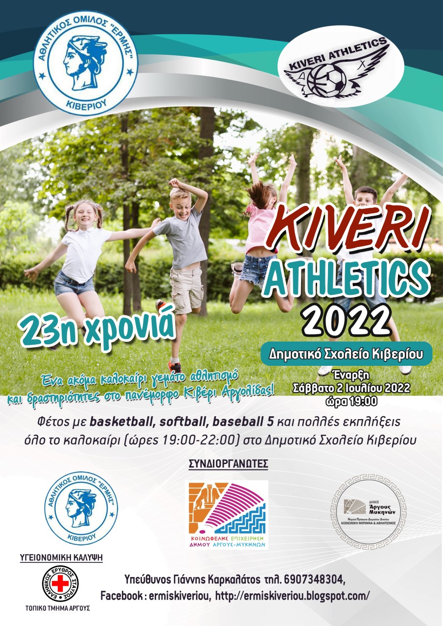 Το τουρνουά KIVERI ATHLETICS με εμπνευστή και υπεύθυνο τον Γιάννη Καρκαλάτο διοργανώνεται για 23η συνεχόμενη χρονιά στο Δημοτικό Σχολείο Κιβερίου από τις 7:00 έως τις 10:00 το βράδυ. Basketball, Softball, Baseball 5, κ.α.
