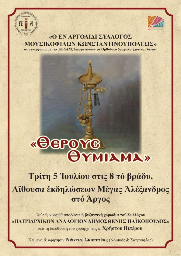 • Ο Εν Αργολίδι Σύλλογος Μουσικόφιλων Κωνσταντινουπόλεως σε συνεργασία με την ΚΕΔΑΜ, διοργανώνουν το Ορθόδοξο δρώμενο ήχου και λόγου με τίτλο «Θέρους Θυμίαμα», την Τρίτη 5 Ιουλίου 2022 και ώρα 8 μμ στην αίθουσα τέχνης και πολιτισμού Μέγας Αλέξανδρος.