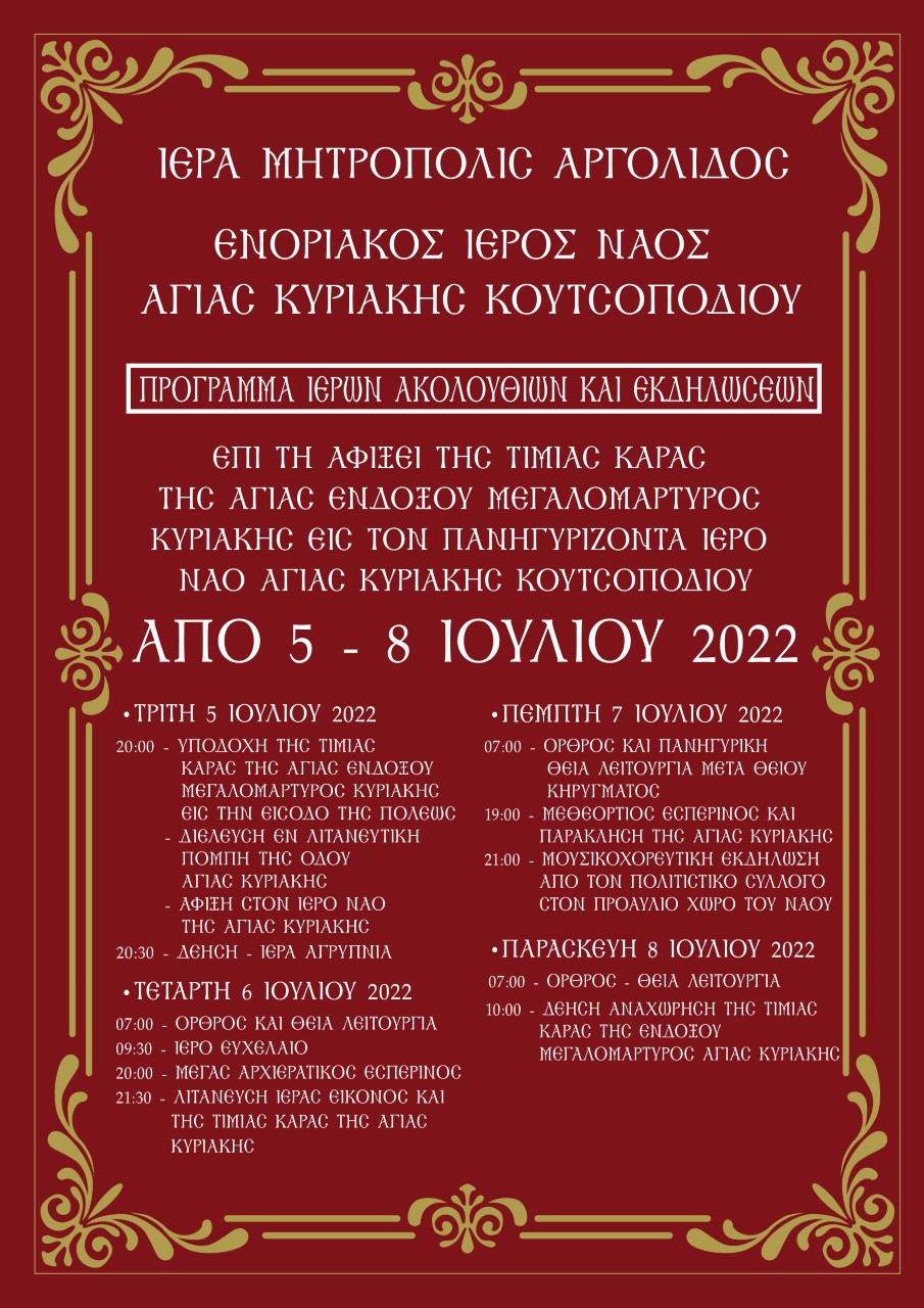 • 5-8 Ιουλίου 2022 η Τίμια Κάρα της Αγίας Κυριακής θα βρίσκεται για προσκήνυμα στον πανηγυρίζοντα Ι. Ν. Αγ. Κυριακής Κουτσοποδίου.