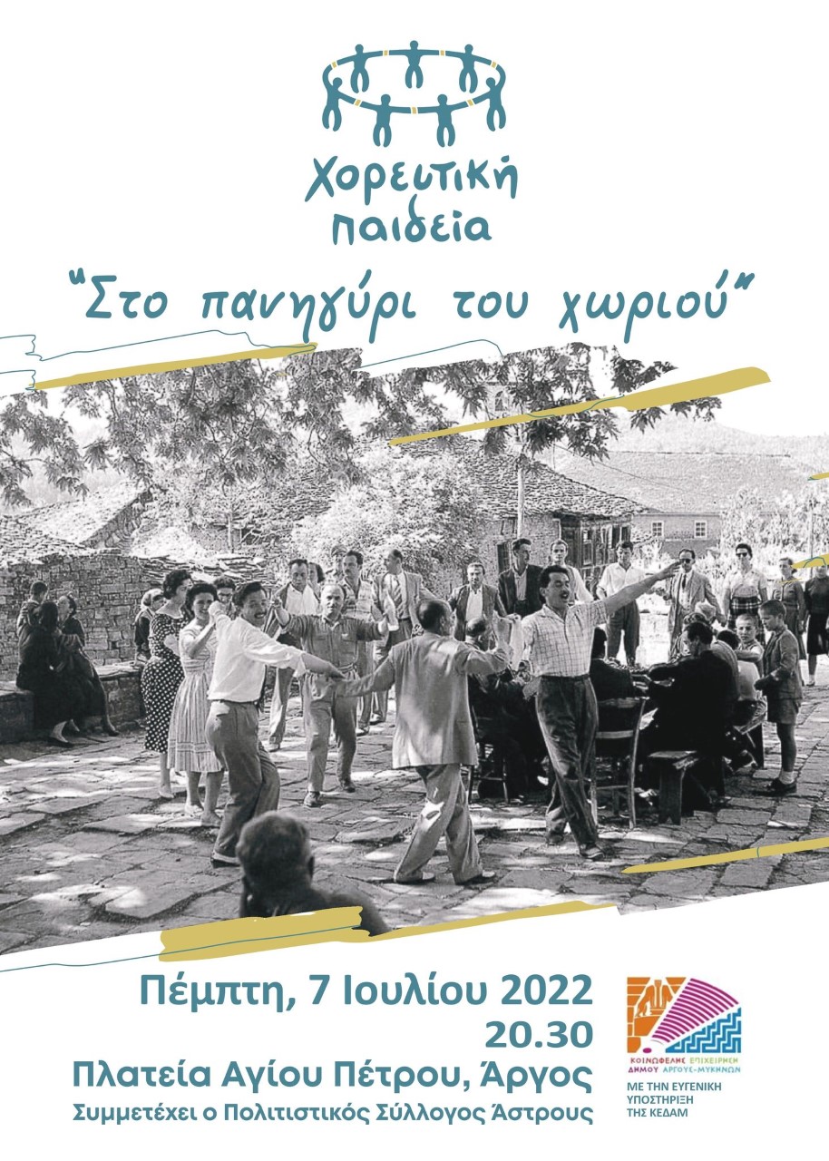 • «Στο πανηγύρι του χωριού» καλεί ο Πολιτιστικός Λαογραφικός σύλλογος Χορευτική Παιδεία, την Πέμπτη 7 Ιουλίου 2022 και ώρα 8:30 μμ στην πλατεία Αγ. Πέτρου στο Άργος. Συμμετέχει ο πολιτιστικός σύλλογος Άστρους. Η βραδιά διοργανώνεται με την ευγενική υποστήριξη της ΚΕΔΑΜ.