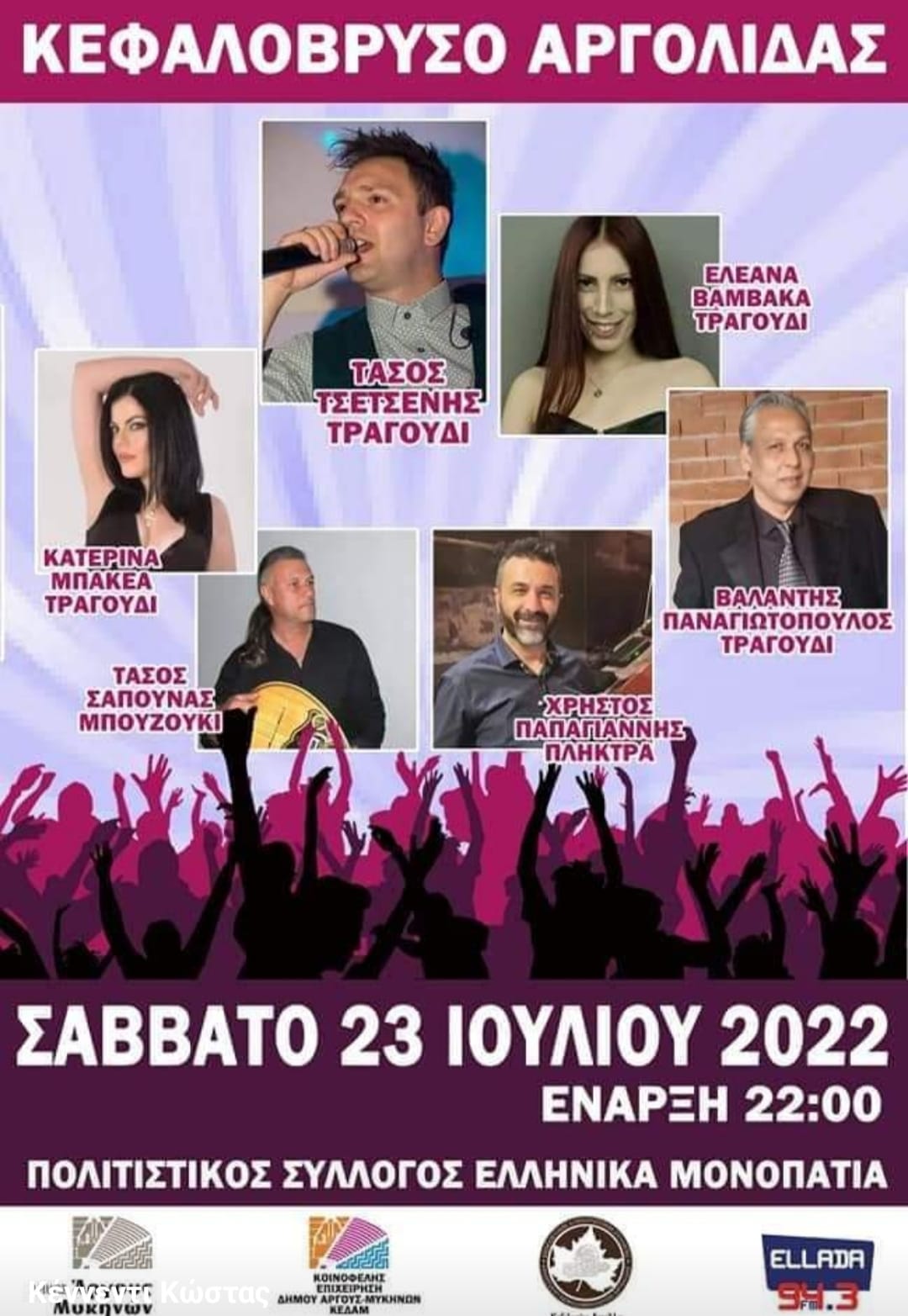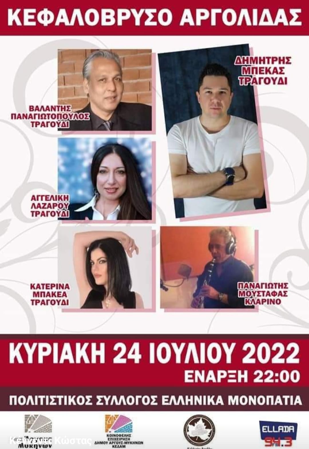 Όαση δροσιάς η συνέχεια των πολιτιστικών εκδηλώσεων της Κοινωφελούς Επιχείρησης Δήμου Άργους-Μυκηνών στην καρδιά του καλοκαιριού, από την Τρίτη 19 Ιουλίου έως και την Δευτέρα 25 Ιουλίου. Εκδηλώσεις για όλα τα γούστα από το Μουσικοθετρικό Αναλόγιο με την παράσταση «Σμύρνη μανίτσα μου: τα παιδιά του πολέμου» στη Νέα Κίο, χορευτική και θεατρική παράσταση στις Λίμνες, έως την εμφάνιση της Έφης Θώδη στο Κεφαλόβρυσο και του Παναγιώτη Λάλεζα στο Κουτσοπόδι.
