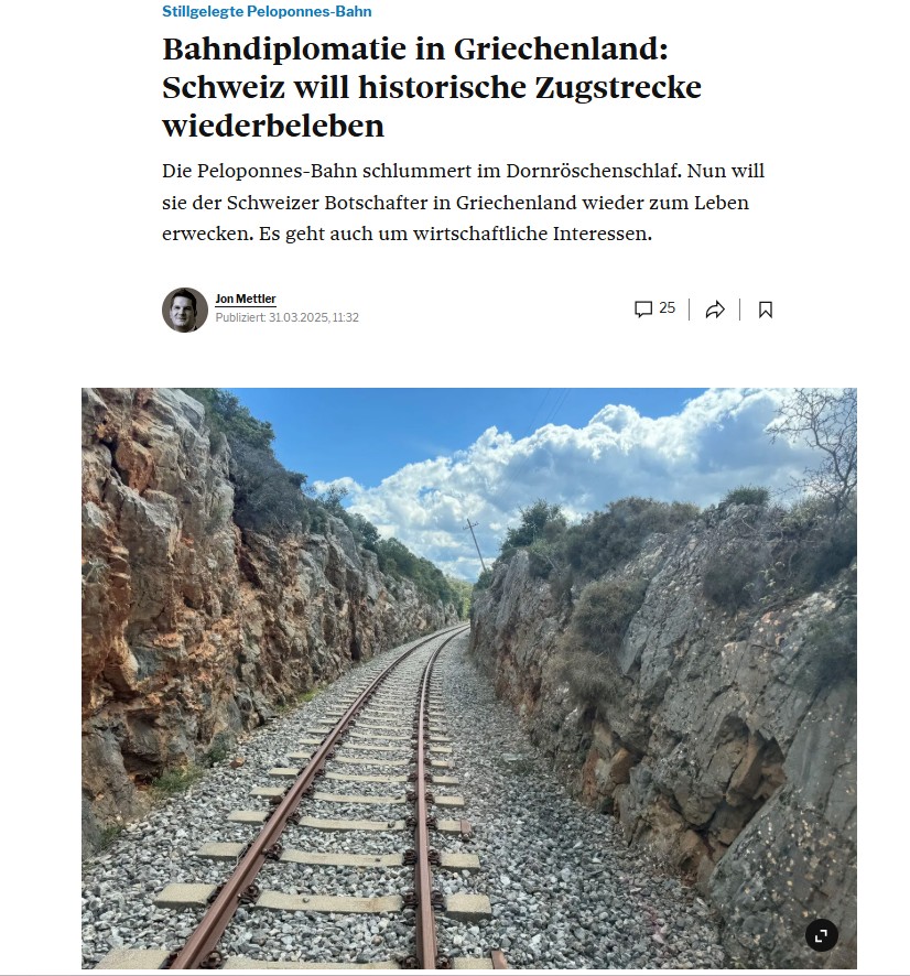 Η ελβετική εφημερίδα Tages-Anzeiger δημοσίευσε πριν λίγες ημέρες ένα εκτενές ρεπορτάζ με τίτλο: «Σιδηροδρομική διπλωματία στην Ελλάδα: Η Ελβετία θέλει να επαναφέρει στη ζωή ιστορική σιδηροδρομική γραμμή». Σ’ αυτό αναλύεται η πρωτοβουλία του Ελβετού πρέσβη στην Αθήνα, Στέφαν Έστερμαν, να συμβάλει στην αναβίωση του σιδηροδρόμου της Πελοποννήσου. Στην προσπάθεια αυτή έχει στο πλευρό του τον φιλέλληνα καθηγητή Χωρικού Σχεδιασμού του Πολυτεχνείου της Ζυρίχης, Μπερντ Σολ, με τον οποίο τον ενώνουν κοινές φιλοδοξίες για την αξιοποίηση του παλιού αλλά πολύτιμου σιδηροδρομικού δικτύου, γεγονός που τους οδήγησε να κάνουν την αυτοψία στο εγκαταλελειμμένο δίκτυο.