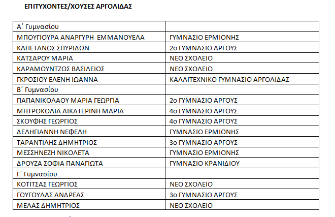Οι τρεις πρώτοι νικητές/τριες μαθητές/τριες ανά τάξη στην Περιφερειακή Ενότητα Αργολίδας είναι οι κάτωθι: