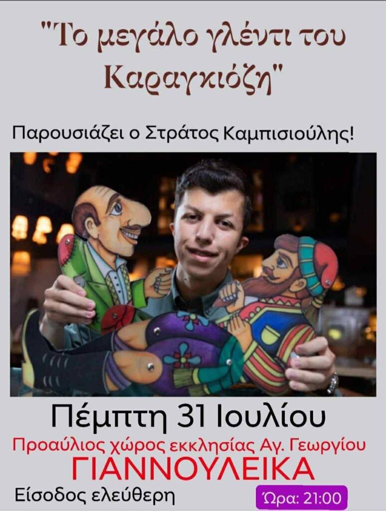 21:00 «Το μεγάλο γλέντι του Καραγκιόζη» από τον Πολιτιστικός Σύλλογος Γιαννουλεΐκων Κοκκινάδων “Άγιος Γεώργιος” σε συνεργασία με τον Πολιτιστικό Σύλλογο Αρκαδικού στον Προαύλιο χώρο της εκκλησίας Αγίου Γεωργίου στα Γιαννουλεΐκα