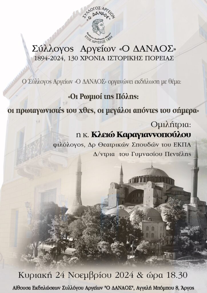 Ο Σύλλογος Αργείων «Ο ΔΑΝΑΟΣ», διοργανώνει στο Μέγαρό του την Κυριακή 24 Νοεμβρίου 2024 και ώρα 18.30 π.μ. εκδήλωση / ομιλία από την συμπολίτισσα μας, κ. ΚΛΕΙΩ ΚΑΡΑΓΙΑΝΝΟΠΟΥΛΟΥ, φιλόλογο, δρα Θεατρικών Σπουδών του ΕΚΠΑ & Δντρια του Γυμνασίου Πεντέλης, με θέμα: «Οι Ρωμιοί της Πόλης: οι πρωταγωνιστές του χθες, οι μεγάλοι απόντες του σήμερα».