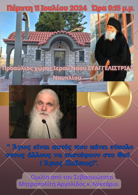 Στις 11 Ιουλίου 2024,ημέρα Πέμπτη και ώρα 9:15 μ.μ., μετά το πέρας Αρχιερατικού Εσπερινού στον Ιερό Ναό του Οσίου Παϊσίου στην Ευαγγελίστρια Ναυπλίου, θα πραγματοποιηθεί ομιλία στον προαύλιο χώρο του Ιερού Ναού από τον Σεβασμιότατο Μητροπολίτη Αργολίδος κ. Νεκτάριο με θέμα: