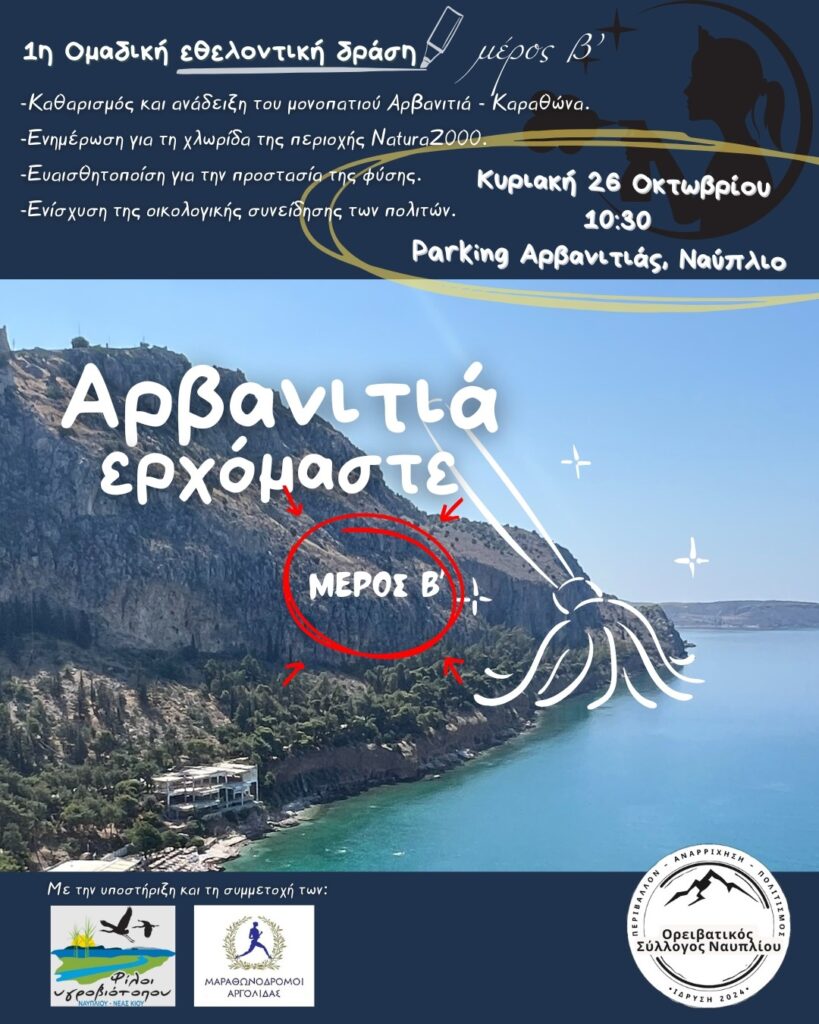Ο Ορειβατικός Σύλλογος Ναυπλίου διοργανώνει την πρώτη ομαδική εθελοντική δράση καθαρισμού και ανάδειξης του Μονοπατιού Αρβανιτιά – Καραθώνα, που θα πραγματοποιηθεί την: