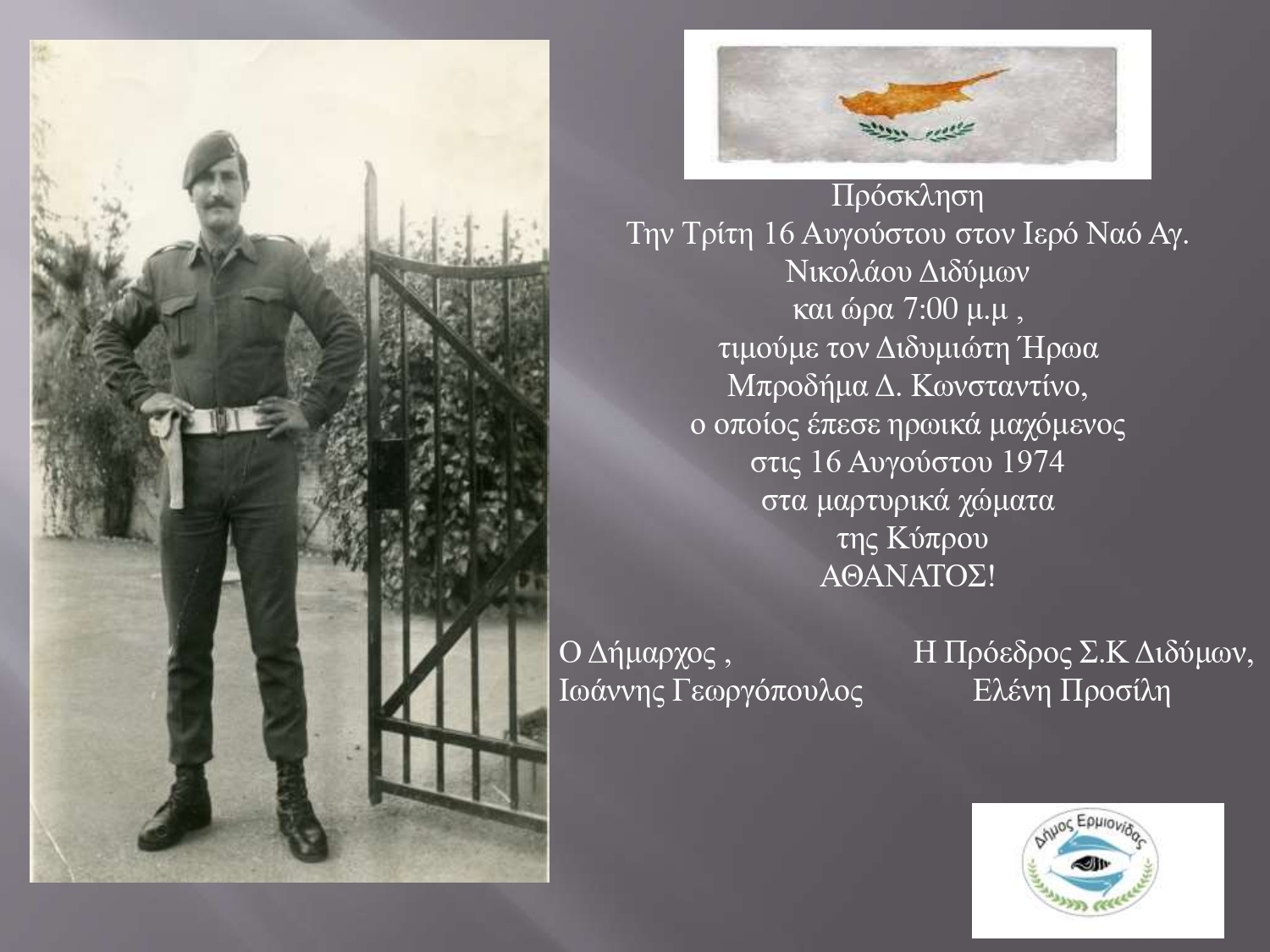 Την Τρίτη 16 Αυγούστου στον Ιερό Ναό Αγ. Νικολάου Διδύμων και ώρα 7:00 μ.μ , τιμούμε τον Διδυμιώτη Ήρωα Μπροδήμα Δ. Κωνσταντίνο.