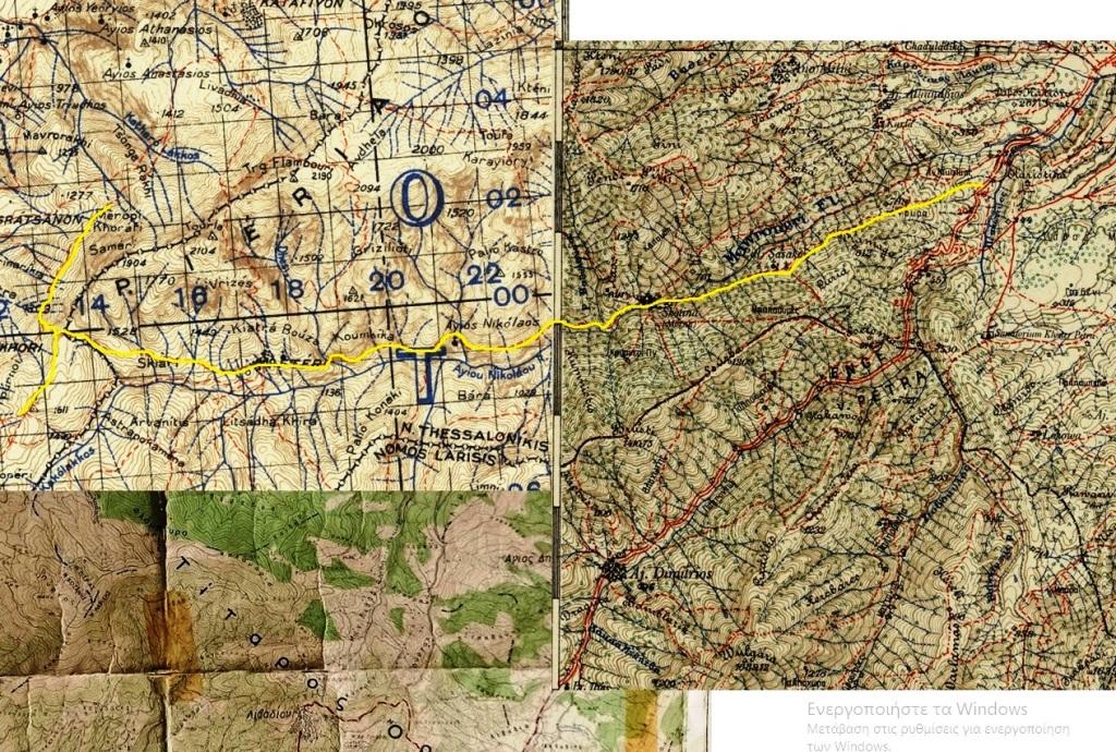 Φωτ. 2 Τροποποιημένη φωτογραφία σύνθεσης χαρτών γης πριν του 1934 όπου αποτυπώνετε (κίτρινη γραμμή) το τμήμα του δρόμου που διέσχιζαν τα Πιέρια Όρη μέσω της στενής κοιλάδας του Μαυρονερίου.