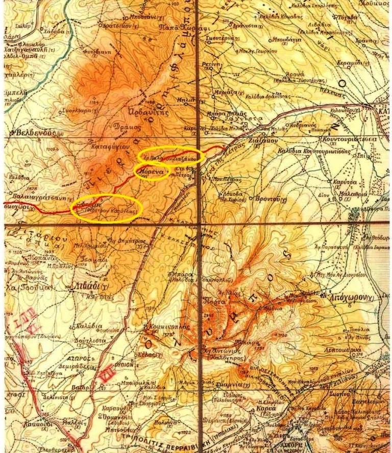 Φωτ. 4 Λεπτομερής χάρτης του 1910 της περιοχής όπου αποτυπώνεται (Κόκκινη γραμμη) ο δρόμος που διερχόταν από το Παλιοζάζιακο, τη Μόρνα και την Φτέρη (Θέρετρο Καρίτσας) Έκδοση Κοντογόνη 1910.