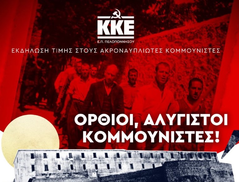 Μεγάλη εκδήλωση με ομιλία του ΓΓ της ΚΕ του ΚΚΕ Δημήτρη Κουτσούμπα θα πραγματοποιήσει η Οργάνωση Περιοχής Πελοποννήσου το Σάββατο 18 Απρίλη στο Ναύπλιο, στις 7.30 μ.μ. στην πλατεία Δημαρχείου, τιμώντας τους χιλιάδες κομμουνιστές που ήταν φυλακισμένοι στην Ακροναυπλία και ορισμένοι εκτελέστηκαν στο Σκοπευτήριο της Καισαριανής την 1η Μάη 1944 από τους Γερμανούς – ναζί κατακτητές.