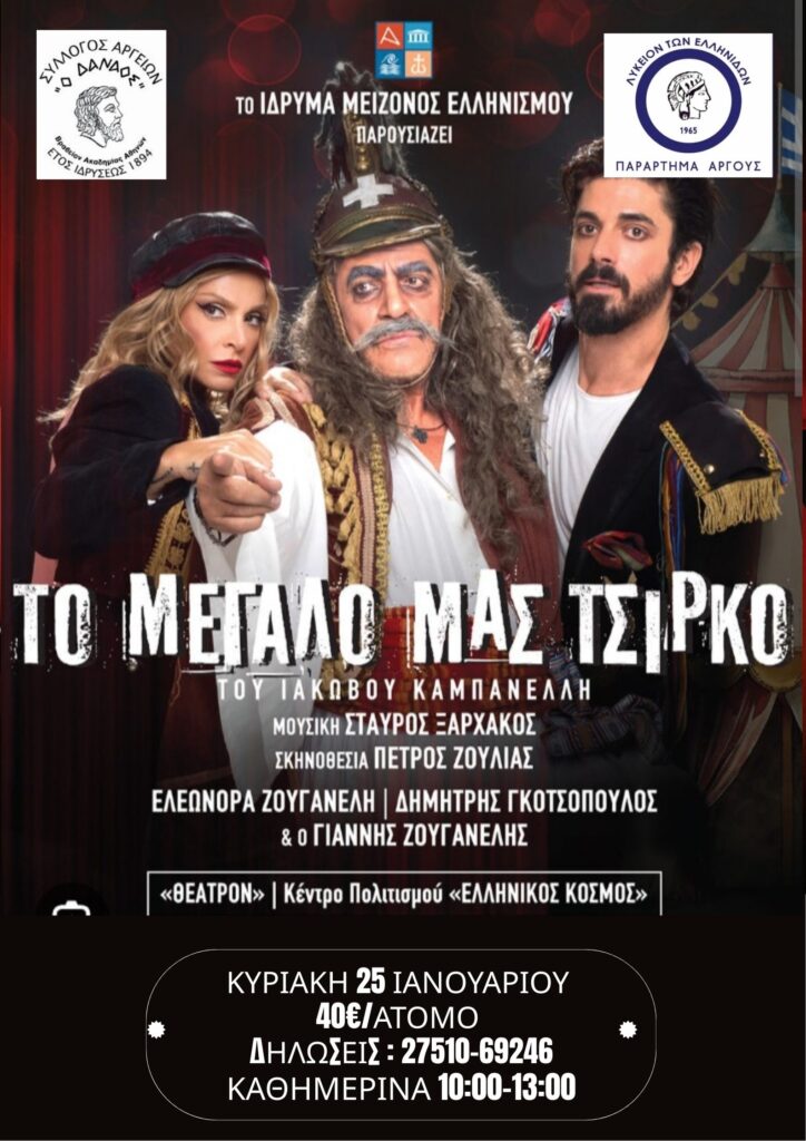 Ο Σύλλογος Αργείων “Ο Δαναός” σε συνεργασία με το Λύκειον των Ελληνίδων παράρτημα Άργους διοργανώνουν εκδρομή στην Αθήνα, την ΚΥΡΙΑΚΗ 25 ΙΑΝΟΥΑΡΙΟΥ 2026 για την παρακολούθηση της παράστασης ” Το Μεγάλο μας Τσίρκο” του Ιάκωβου Καμπανέλλη στη σκηνή του θεάτρου Ελληνικός Κόσμος του Ιδρύματος Μείζονος Ελληνισμού (απογευματινή παράσταση).