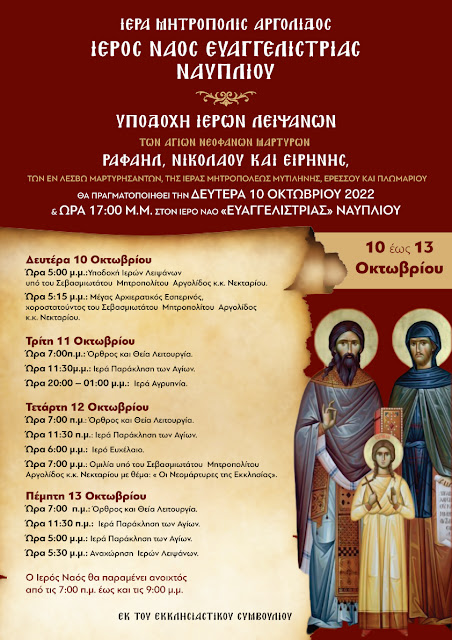 Πάνδημος αναμένεται να είναι η συμμετοχή των πιστών Χριστιανών στην υποδοχή των Ιερών λειψάνων των Αγίων Νεοφανών Μαρτύρων Ραφαήλ, Νικολάου και Ειρήνης από την Ιερά Μονή, της Ιεράς Μητροπόλεως Μυτιλήνης, Ερεσσσού και Πλωμαρίου, στον Ιερό Ναό Ευαγγελιστρίας στο Ναύπλιο.