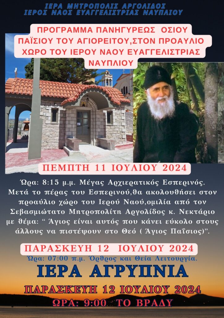 Γίνεται γνωστό ότι,στις 12 Ιουλίου 2024,εορτή του Οσίου Παϊσίου του Αγιορείτου, πανηγυρίζει το παρεκκλήσιο του Ιερού Ναού του Οσίου Παϊσίου στην Ευαγγελίστρια Ναυπλίου.