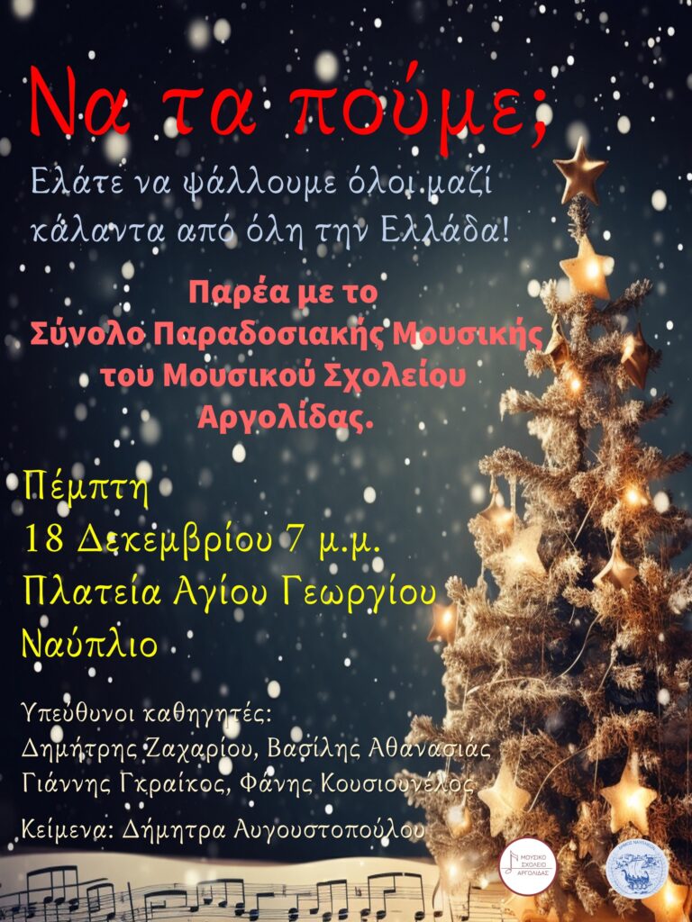 Το Μουσικό Σχολείο Αργολίδας, συμμετέχοντας στις χριστουγεννιάτικες εκδηλώσεις του Δήμου Ναυπλιέων, σας προσκαλεί σε εορταστική εκδήλωση που θα γίνει την Πέμπτη 18 Δεκεμβρίου 2025, στις 7 μ.μ. στην Πλατεία του Αγίου Γεωργίου στο Ναύπλιο. Το Σύνολο Παραδοσιακής Μουσικής του σχολείου θα παρουσιάσει παραδοσιακά κάλαντα από όλη την Ελλάδα, για τις τρεις εορτές του Δωδεκαημέρου (Χριστούγεννα, Πρωτοχρονιά και Θεοφάνια). Θα χαρούμε πολύ να μας τιμήσετε με την παρουσία σας και να ψάλλουμε όλοι μαζί τα κάλαντα, σε ένα εορταστικό και χαρμόσυνο κλίμα, μαζί με τους μαθητές και τους καθηγητές του σχολείου μας.