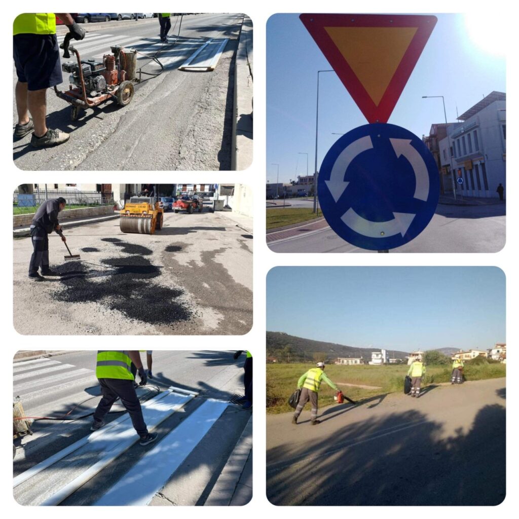 Πιο συγκεκριμένα συνεργεία του Δήμου με τα κατάλληλα μηχανήματα αρχικά προχώρησαν στη διαγράμμιση και στο βάψιμο διαβάσεων πεζών σε πολυσύχναστους δρόμους ενώ παράλληλα συνεχίστηκαν οι εργασίες επουλώσεων λάκκων σε διάφορα σημεία του Δήμου.