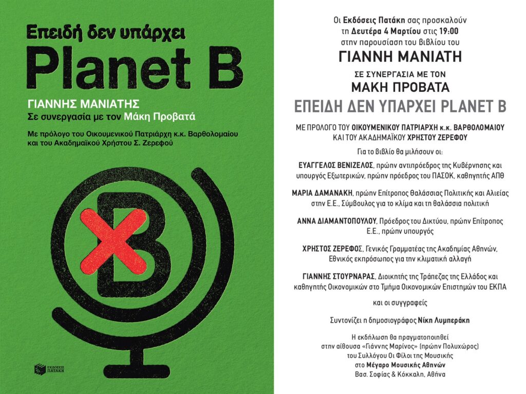 Τη Δευτέρα 4 Μαρτίου, στις 19.00, στο Μέγαρο Μουσικής θα πραγματοποιηθεί η παρουσίαση του βιβλίου του πρώην βουλευτή Αργολίδας και πρώην υπουργού Περιβάλλοντος, Γιάννη Μανιάτη, με τίτλο, «Επειδή δεν υπάρχει Planet B».