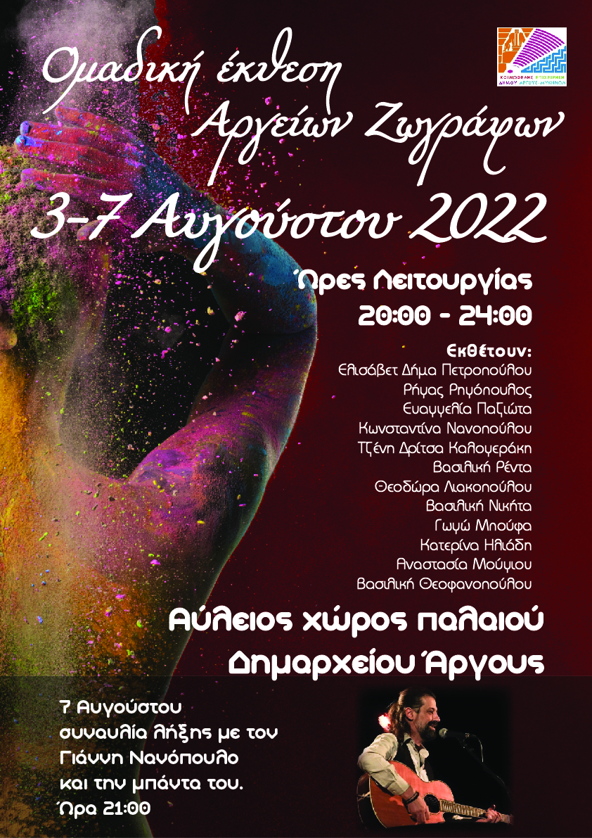Η ΚΕΔΑΜ διοργανώνει την συναυλία λήξης της Ομαδικής Έκθεσης Αργείων Ζωγράφων, στην πλατεία Αγ. Πέτρου. Ώρα έναρξης: 9.00 μμ