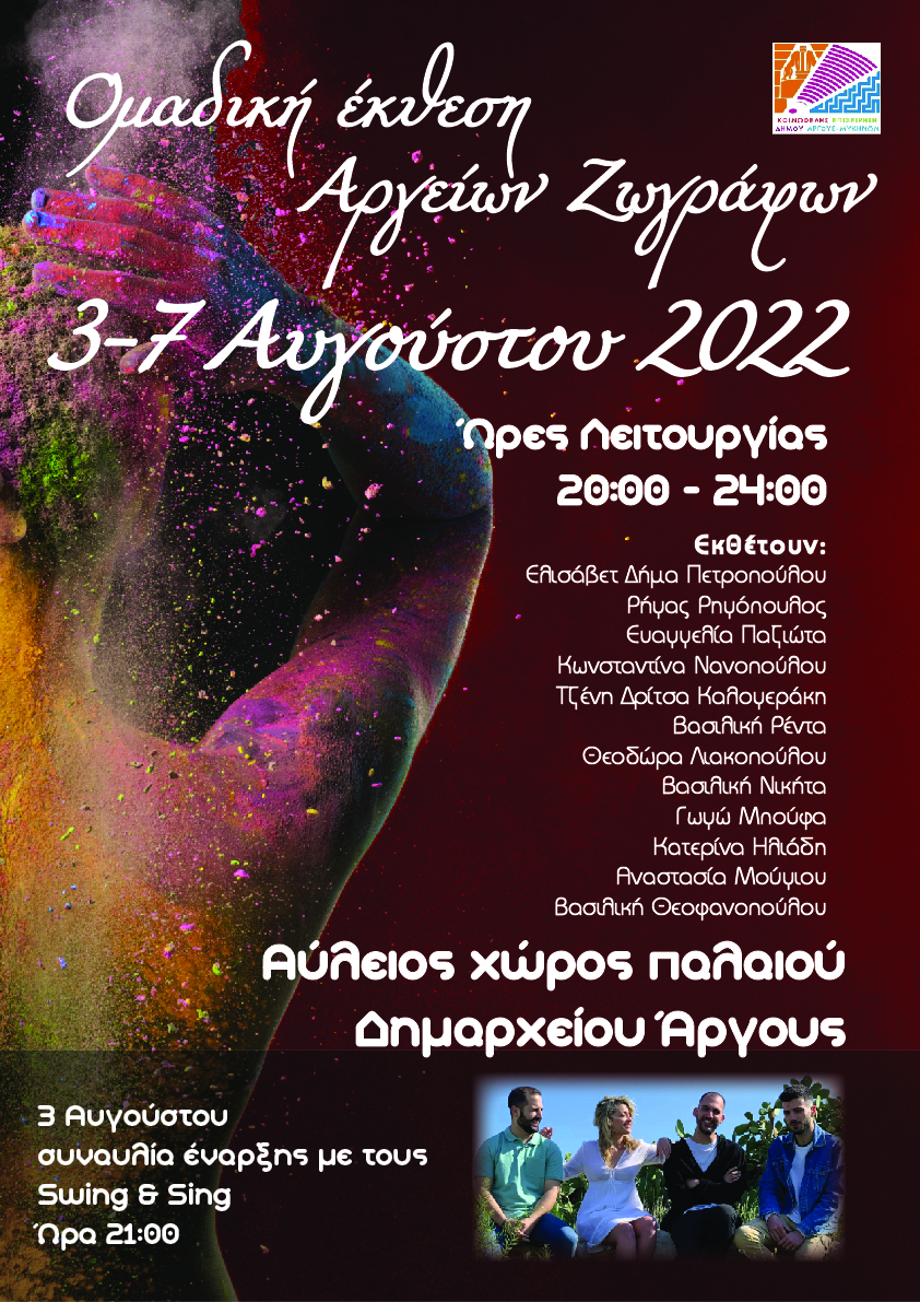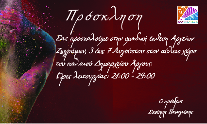 Η ΚΕΔΑΜ διοργανώνει την συναυλία έναρξης της Ομαδικής Έκθεσης Αργείων Ζωγράφων, στην πλατεία Αγ. Πέτρου. Ώρα έναρξης: 9.00 μμ