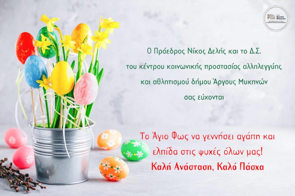 Ο Πρόεδρος και το Δ.Σ του Κέντρου Κοινωνικής Μέριμνας & Αθλητισμού Δήμου Άργους Μυκηνών εύχονται σε όλους Καλή Ανάσταση και Καλό Πάσχα και σας ενημερώνουν πως το ΔΑΚ Άργους θα παραμείνει κλειστό από την Μεγάλη Πέμπτη στις 18:00 το απόγευμα έως και την Δευτέρα του Πάσχα 25/4.